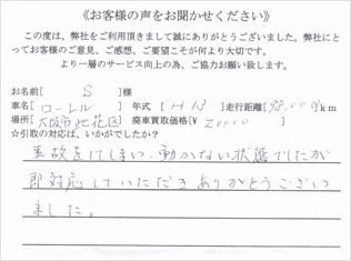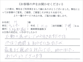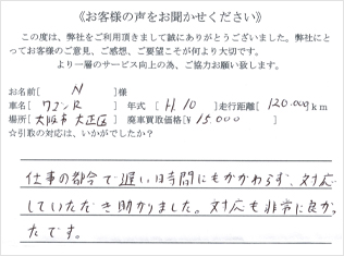 対応も非常に良かったです。車名 ワゴンR 年式 H10 走行距離 120,000km 場所 大阪市大正区 廃車買取り価格 15,000円 -