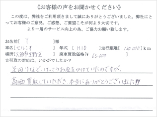 高価買取していただき本当にありがとうございました!!車名 セルシオ 年式 H10 走行距離 130,000km 場所 大阪市生野区 廃車買取り価格 65,000円 -